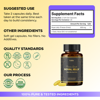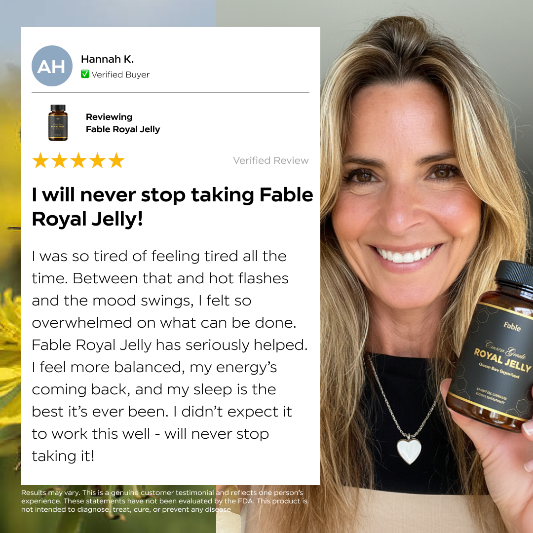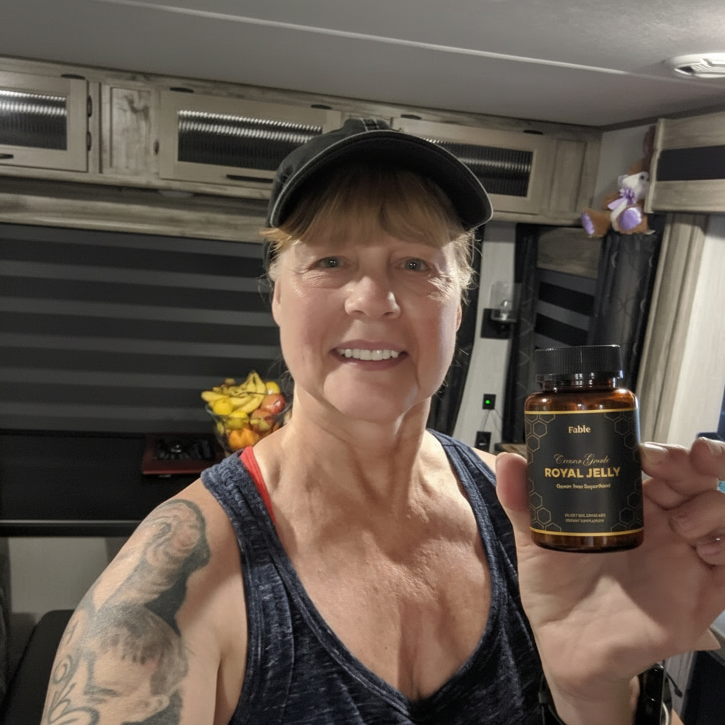 I can honestly say I was very skeptical at first, but the first day I took my first two capsules and I didn’t think I was gonna feel anything the next day, but I woke up with more energy than I’ve had in years. I feel like an entirely different person so I’ve been giving it to my sisters and my niece and they’re having the same results. I sleep better at night, my clothes fit better. My skin looks better mostly my digestive system feels the best it’s felt in a very long time. I cannot give Fable Royal Jelly enough praise and I will never stop taking it.